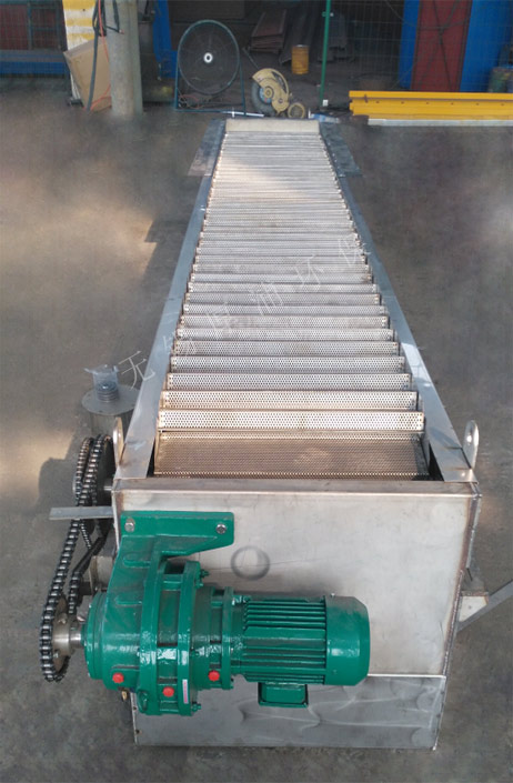 网板式阶梯格栅机的驱动装置位于机架上部,除传动装置外,其余均采用不锈钢材料制造。驱动装置采用轴装式减速机,在机架二侧设置螺旋式调节装置,以作调整传动链条张紧用。