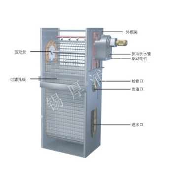 内进流式网板格栅除污机的驱动装置位于机架上部, 为进口品牌SEW轴装式减速机。在机架前后二侧设置了螺旋式调节装置,调整传动链条紧松。